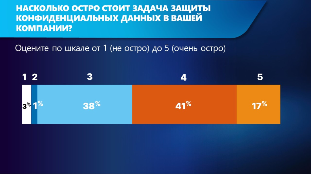 Для большинства опрошенных задача защиты конфиденциальных данных стоит очень остро. 58% присвоили задаче 4 и 5 баллов по пятибалльной шкале.