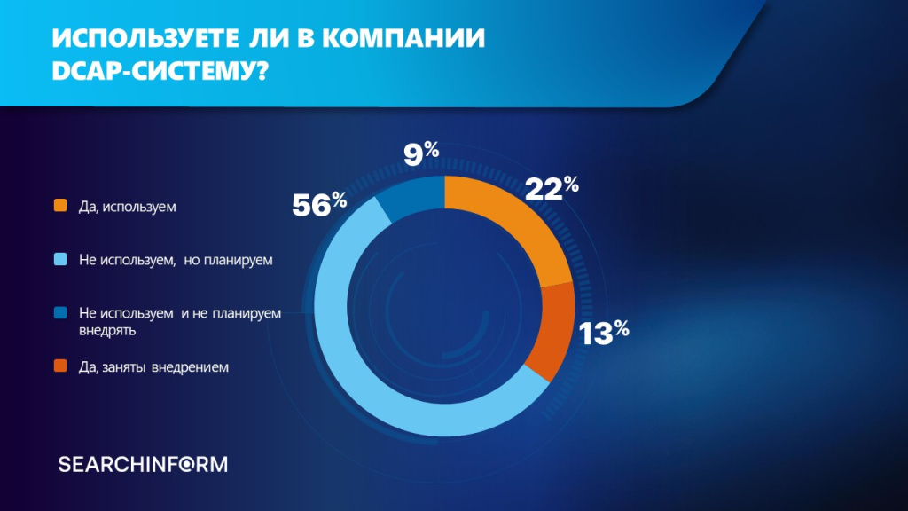 22% опрошенных компаний ответили, что уже используют DCAP-систему, 13% – заняты внедрением. Больше половины (56%) респондентов планируют в будущем использовать DCAP.