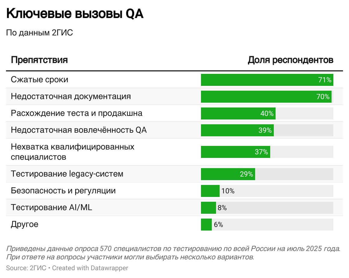 Главным вызовом, влияющим на качество и эффективность тестирования, являются сжатые сроки — на неё указали 71% респондентов. Почти 40% отметили недостаточную вовлечённость тестировщиков в процесс, а 37% сталкиваются с нехваткой квалифицированных кадров.