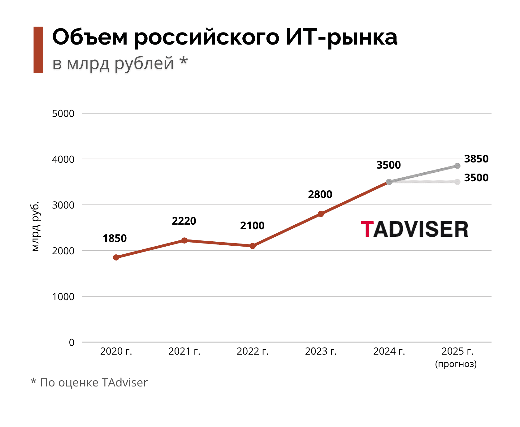 По оценке аналитического центра TAdviser, в 2024 г. российский ИТ-сектор вырос на 25% – до ₽3,5 трлн.