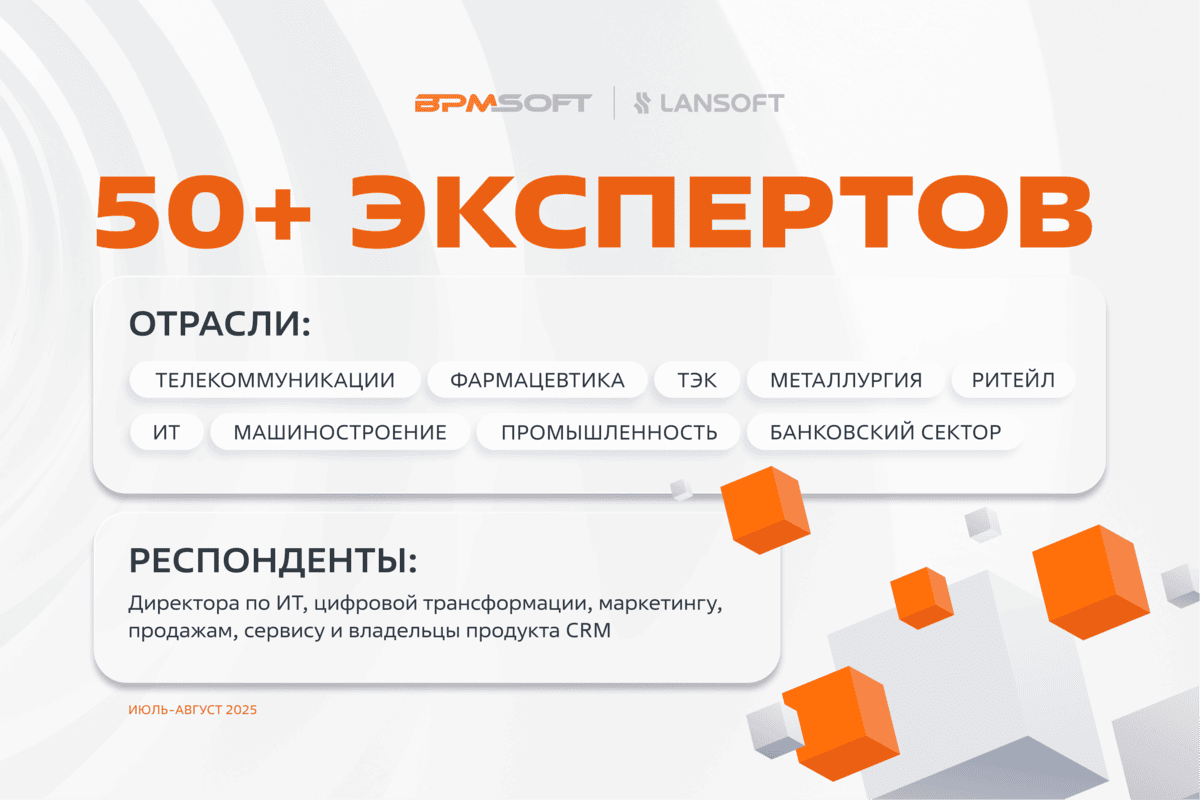 Об исследовании. В исследовании приняли участие 50+ руководителей крупных российских компаний. Респонденты представляют широкий спектр отраслей: от ИТ и телекоммуникаций до банковского сектора, металлургии, машиностроения, фармацевтики, розничной торговли, товаров народного потребления и нефтехимии. Почти половину выборки составили директора по ИТ и цифровой трансформации. Остальные участники – коммерческие директора, руководители по продажам и маркетингу, а также владельцы продукта CRM. Методология основана на глубинных экспертных интервью в формате ВКС (видеоконференцсвязь). Период проведения – июль-август 2025 года. В рамках опроса заказчикам предлагалось оценить по пятибалльной шкале приоритетность функциональных и технологически критериев, характерных для комплексной CRM-системы, а также организационный потенциал вендора.