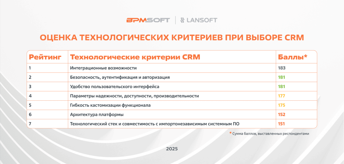 Ключевые технологические критерии при выборе CRM. Респонденты считают интеграционные возможности и бесшовную работу с другими корпоративными системами критически важными для CRM. На втором месте – безопасность, включая аутентификацию и авторизацию, что обусловлено обработкой значительных объемов чувствительных данных. Замыкает ТОП-3 удобство пользовательского интерфейса.