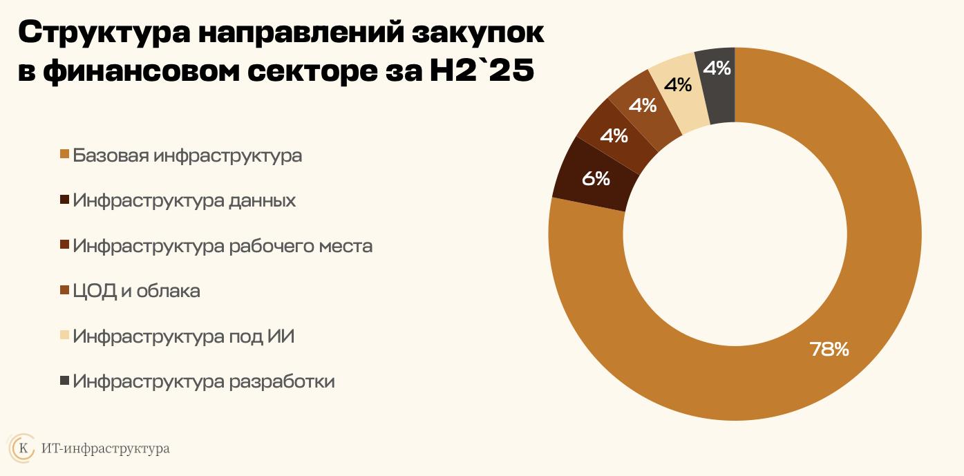 Второе полугодие 2025 года подтвердило стабильность финансового сектора РФ (банки, страховые и инвестиционные компании и иные финансовые учреждения). В отличие от нефтегазохимической, горно-металлургической отраслей и ритейла, где наблюдается или стагнация, или снижение инвестиционной активности в ИТ, в организациях финсектора объем вложений в ИТ-инфраструктуру продолжает расти – на 23% за год. При этом компании «второго эшелона» в 2025 году нарастили закупочную активность в области ИТ-инфраструктуры сильнее, чем отраслевые лидеры, и стали основным драйвером новых проектов. Это уникальная ситуация: ведь в остальных отраслях активнее инвестируют именно лидеры, тогда как небольшие компании либо стагнируют, либо сокращают закупки.