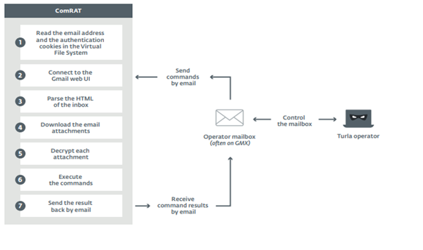 Новая версия ComRAT способна установить контроль над одним из браузеров жертвы. После этого бэкдор может загрузить предопределенный файл cookie и обратиться к Gmail. В почтовом ящике вредонос читает последние письма в папке «Входящие», загружает вложения, читает инструкции, содержащиеся в этих файлах.