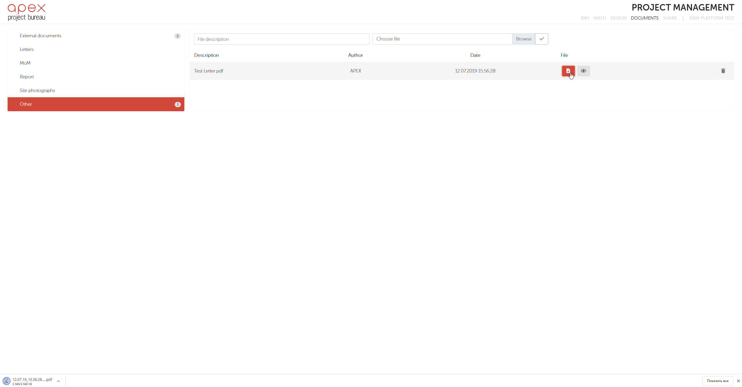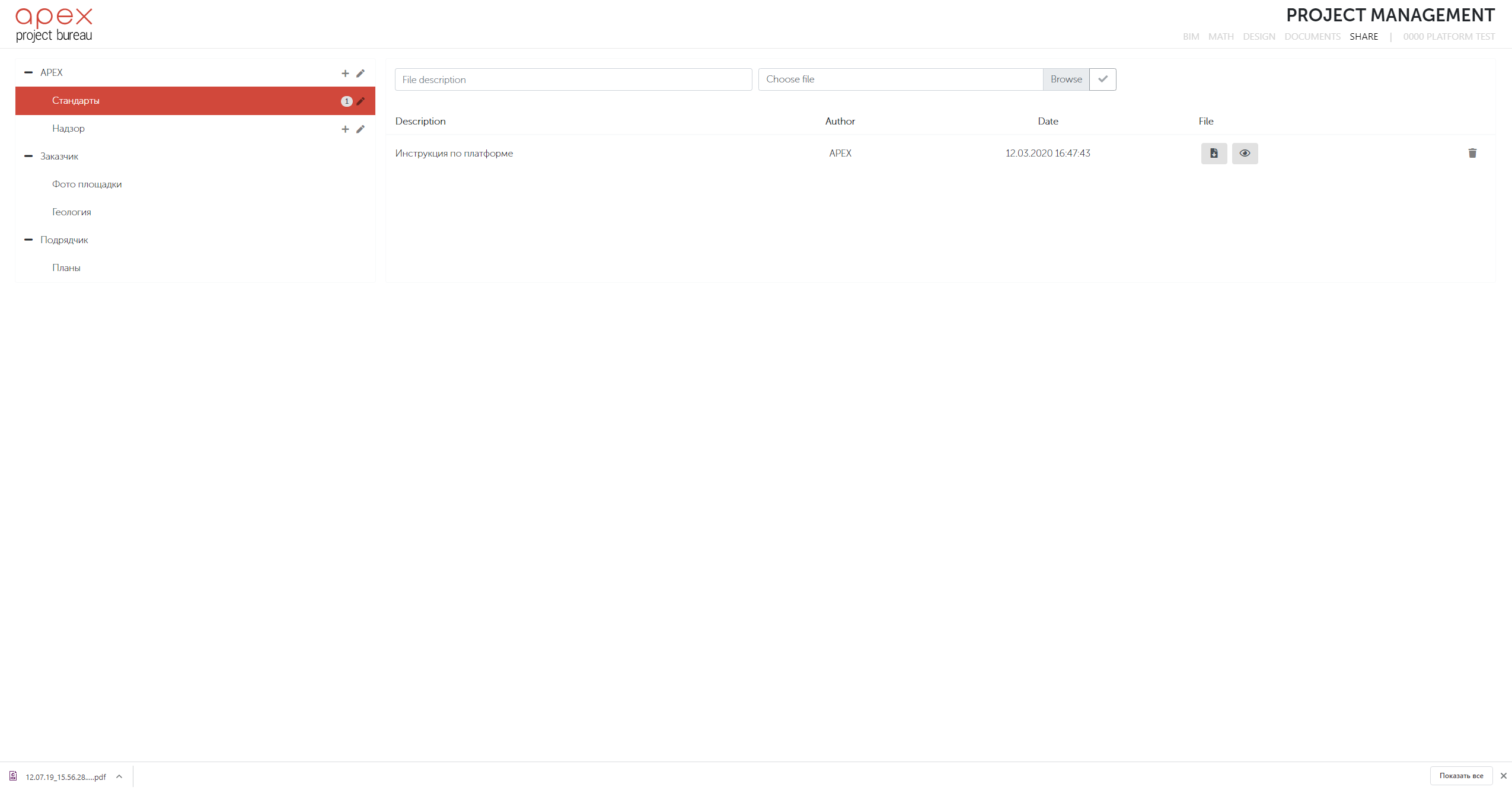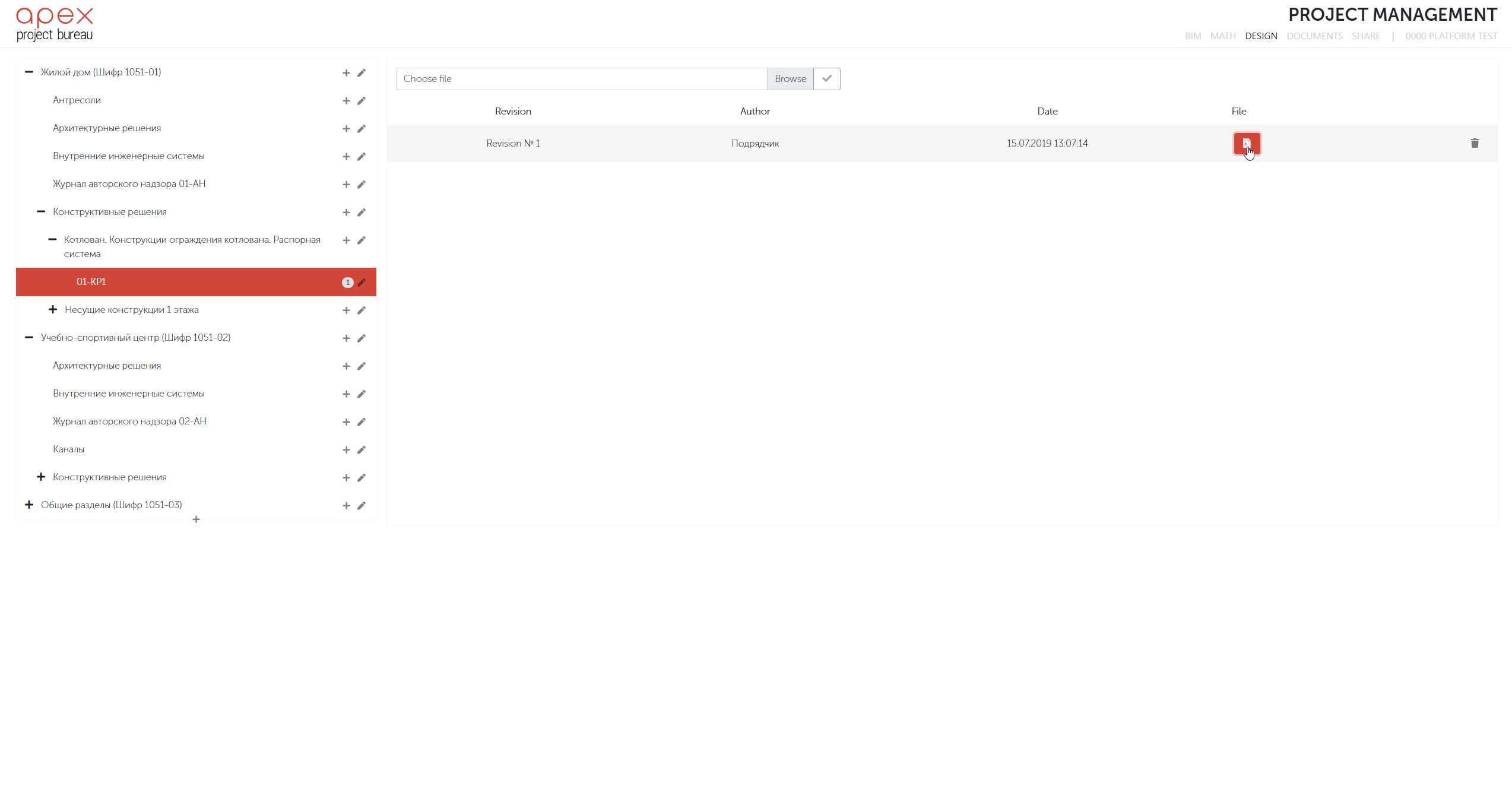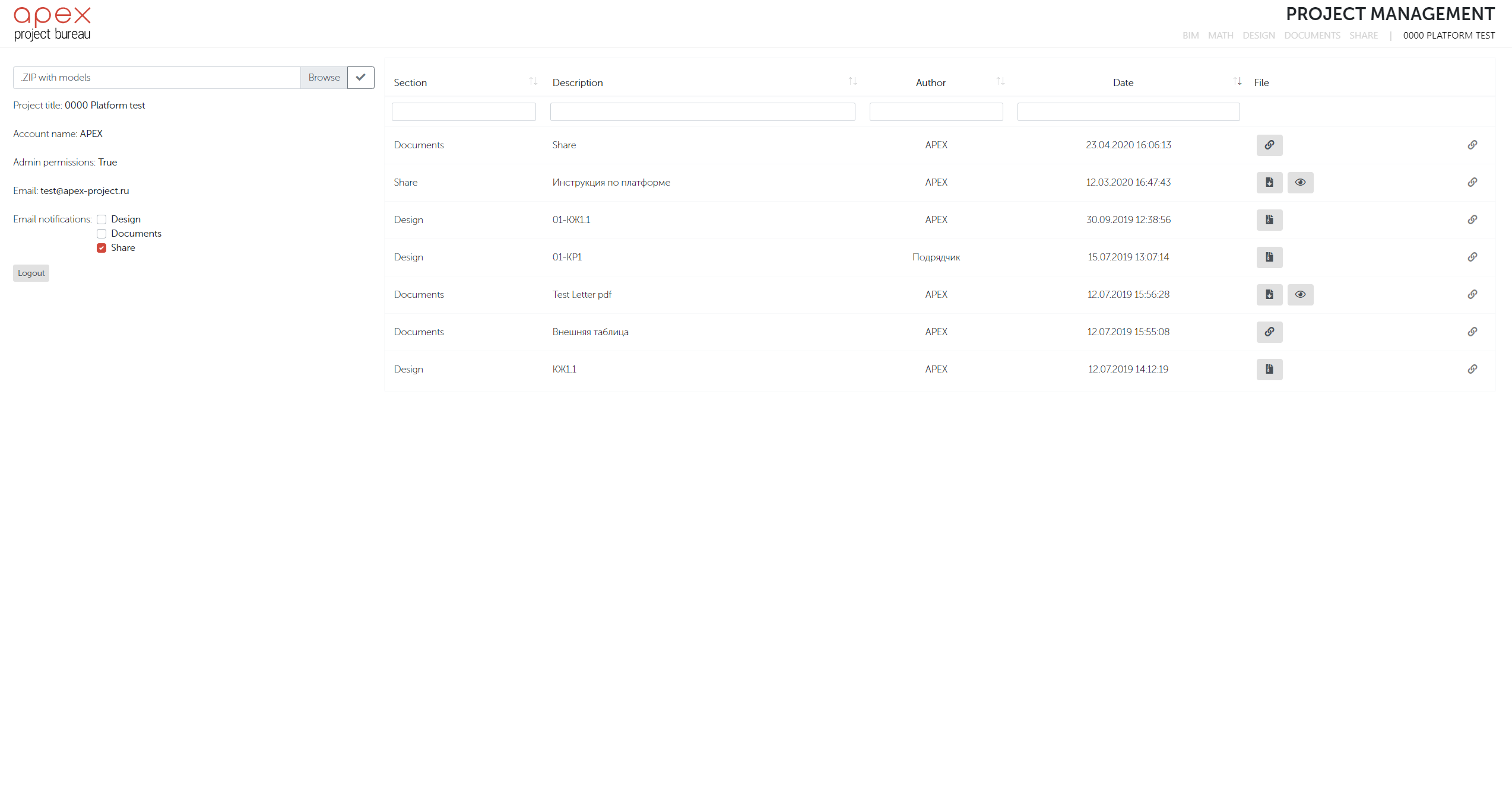 - Платформа обмена - это не только простой обмен документацией, но также множество дополнительных уникальных возможностей.Корректная и актуальная BIM модель, возможность контроля сдачи документации и обмена официальными письмами.Система работает на серверах компании и выгружает специальную, очищенную модель.Происходит обмен связей сданной документации и элементов модели.На платформе есть обмен письмами, фотографиями, файлами и облачным сервисом.Присутствует и модель математического моделирования для более требовательных заказчиков.Протестировать платформу вы можете сами по тестовому аккаунту:Логин: test@apex-project.ruПароль: test