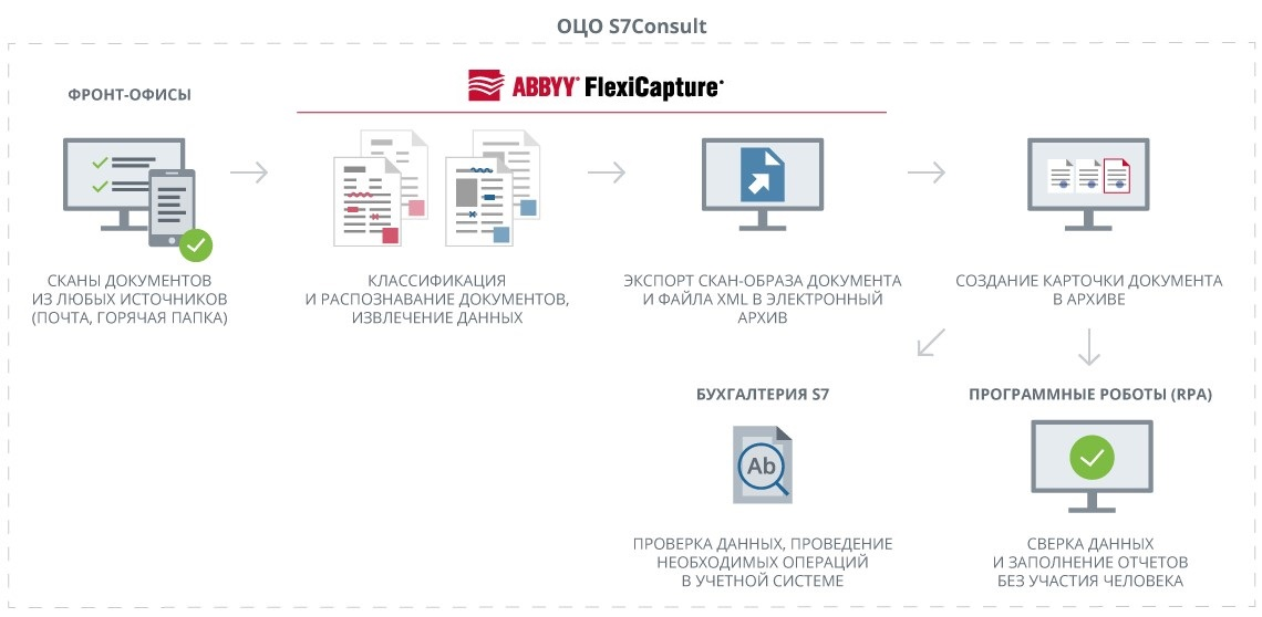 - Сотрудники ОЦО S7 Consult загружают и верифицируют скан-образы документов на станциях ABBYY. Система автоматически определяет 14 типов первичных и отраслевых документов, извлекая из них свыше 100 необходимых атрибутов: