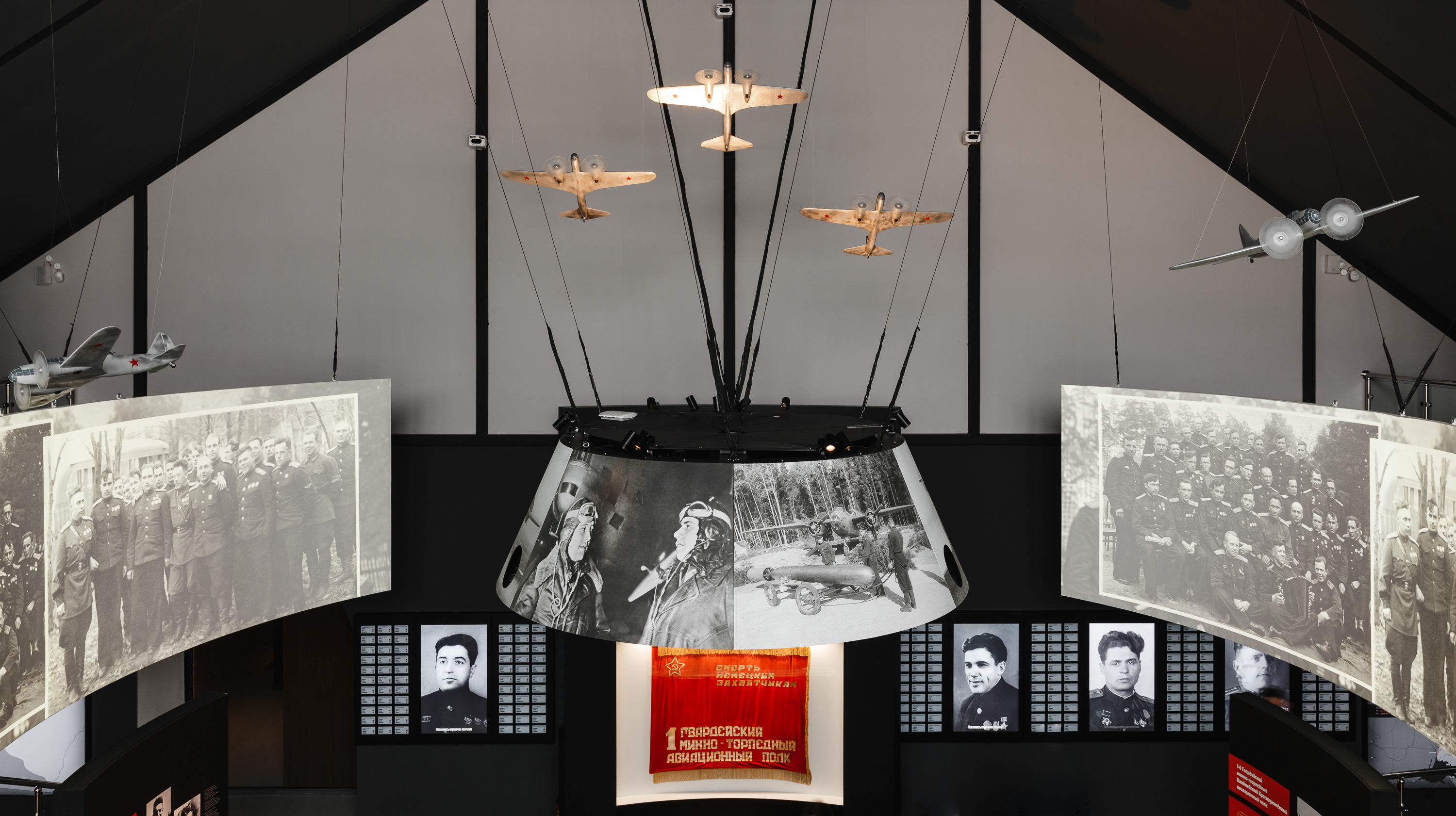 Центральное место здесь отводится инсталляции «Боевой вылет». Она представляет собой полноразмерную копию кабины истребителя Як-9. Это авиасимулятор. Перед зрителями с помощью проекционных экранов создается полная иллюзия полета, происходящего в разных погодных и боевых условиях. Посетитель наблюдает за боевым вылетом торпедоносца глазами лётчика. - География проекта