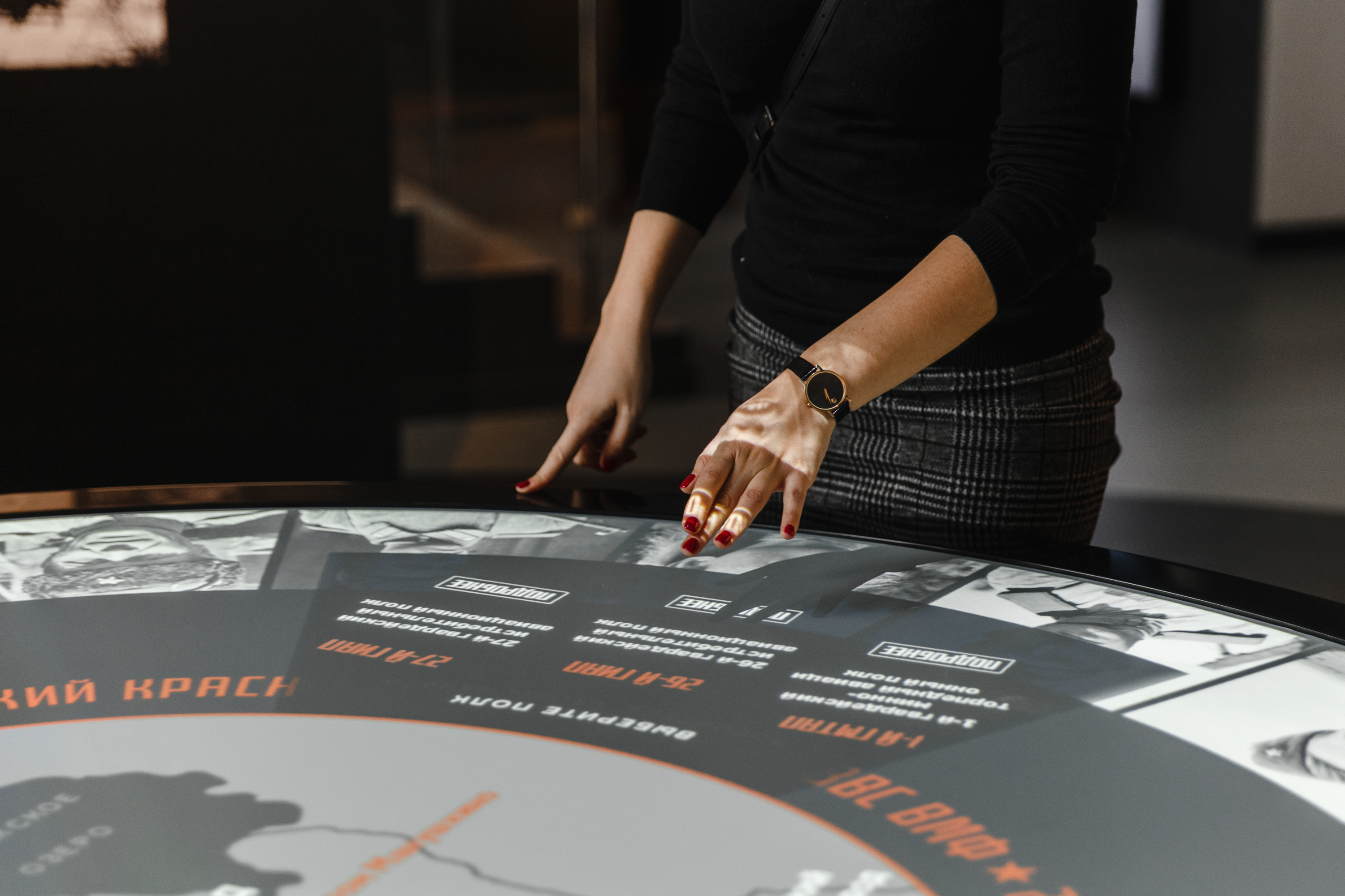 Вторая инсталляция в центральной зоне - подвесные панорамные экраны, расположенные с двух сторон от интерактивного стола. В режиме свободного посещения на экранах в зацикленном режиме отображаются кадры архивной кинохроники. В режиме группового посещения экскурсовод демонстрирует открывающий и завершающий экскурсию видеоролики.