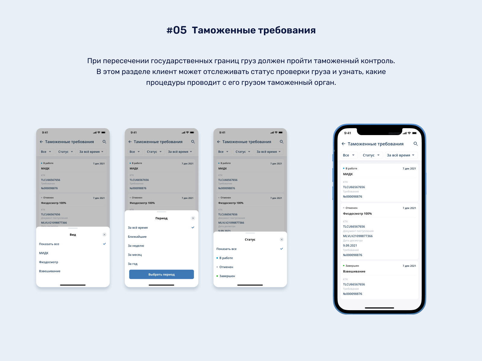 #05 Таможенные требования. При пересечении государственных границ груз должен пройти таможенный контроль. В этом разделе клиент может отслеживать статус проверки груза и узнать, какие процедуры проводит с его грузом таможенный орган.