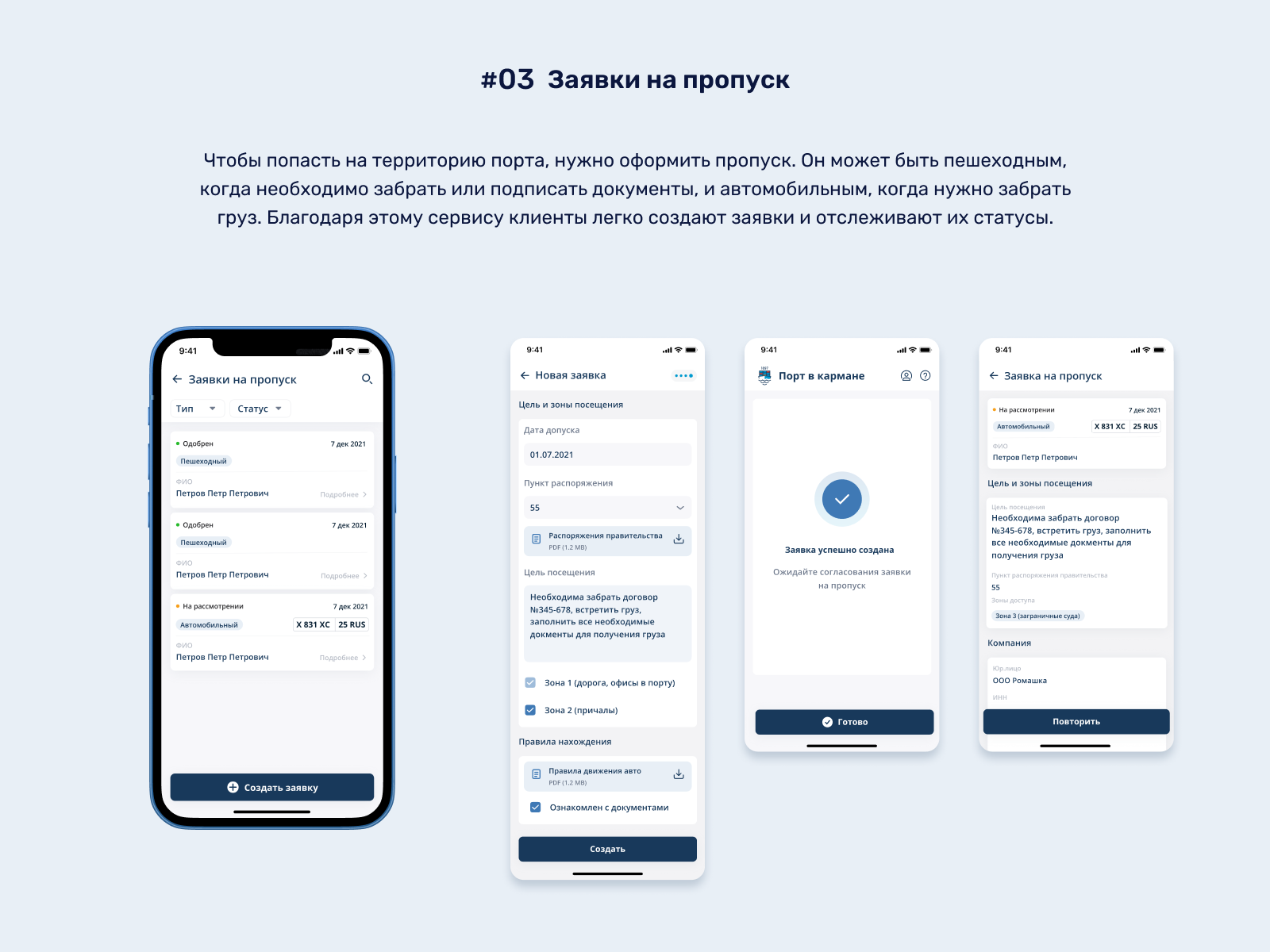 #03 Заявки на пропуск. Чтобы попасть на территорию порта, нужно оформить пропуск. Он может быть пешеходным, когда необходимо забрать или подписать документы, и автомобильным, когда нужно забрать груз. Благодаря этому сервису клиенты легко создают заявки и отслеживают их статусы.