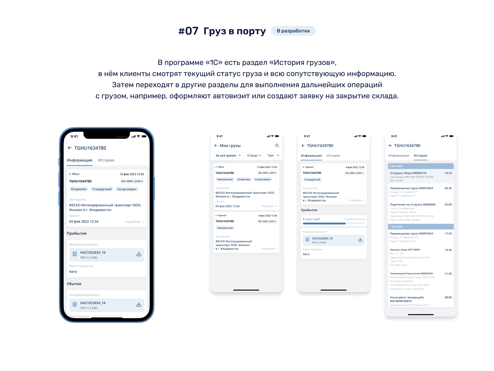 #07 Груз в порту (в разработке). В программе «1С» есть раздел «История грузов», в нём клиенты смотрят текущий статус груза и всю сопутствующую информацию. Затем переходят в другие разделы для выполнения дальнейших операций с грузом, например, оформляют автовизит или создают заявку на закрытие склада. Мы выяснили, что такое переключение между сервисами требует от пользователя много времени и постоянной концентрации на задаче. Это может быть проблемой, когда клиент хочет в короткие сроки провести все необходимые операции с грузом. Мы решили облегчить жизнь пользователя. Так появился сервис «Груз в порту», в котором клиенты смогут не только работать с историей груза, но и планировать любые возможные операции с грузами в одном месте.