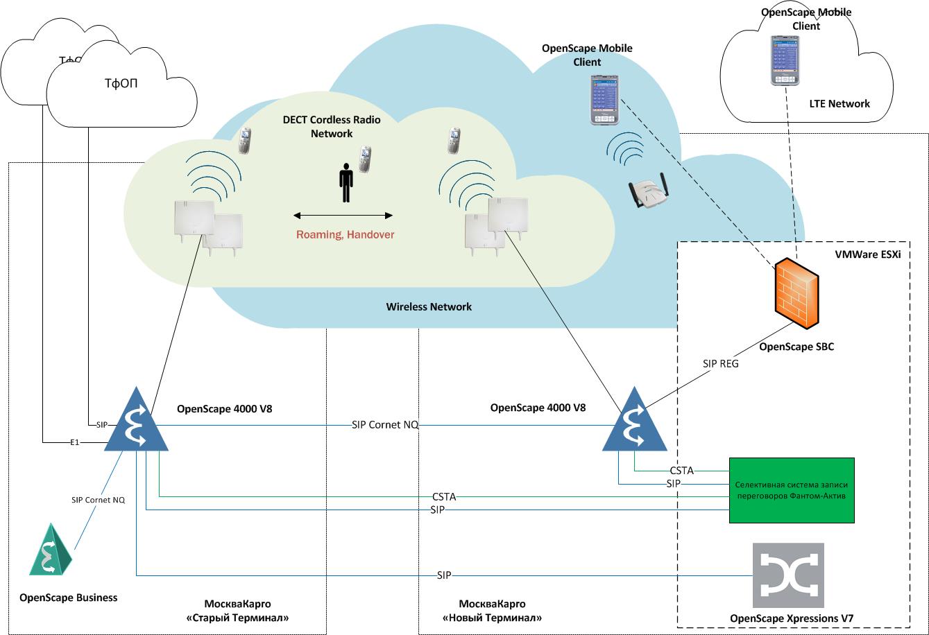 Корпоративная сеть связи Заказчика состоит 2-х АТС OS4000 V8 и одной АТС OSB V2. АТС находятся на разных площадках в разных зданиях. На территории Заказчика развёрнуто классическое TDM приложение OS Cordless V7 (DECT), которое имеет территориально-распределённую архитектуру. OS Cordless V7 покрывает 2 площадки. Между площадками запрограммирован сетевой роуминг. Количество базовых станций 120.