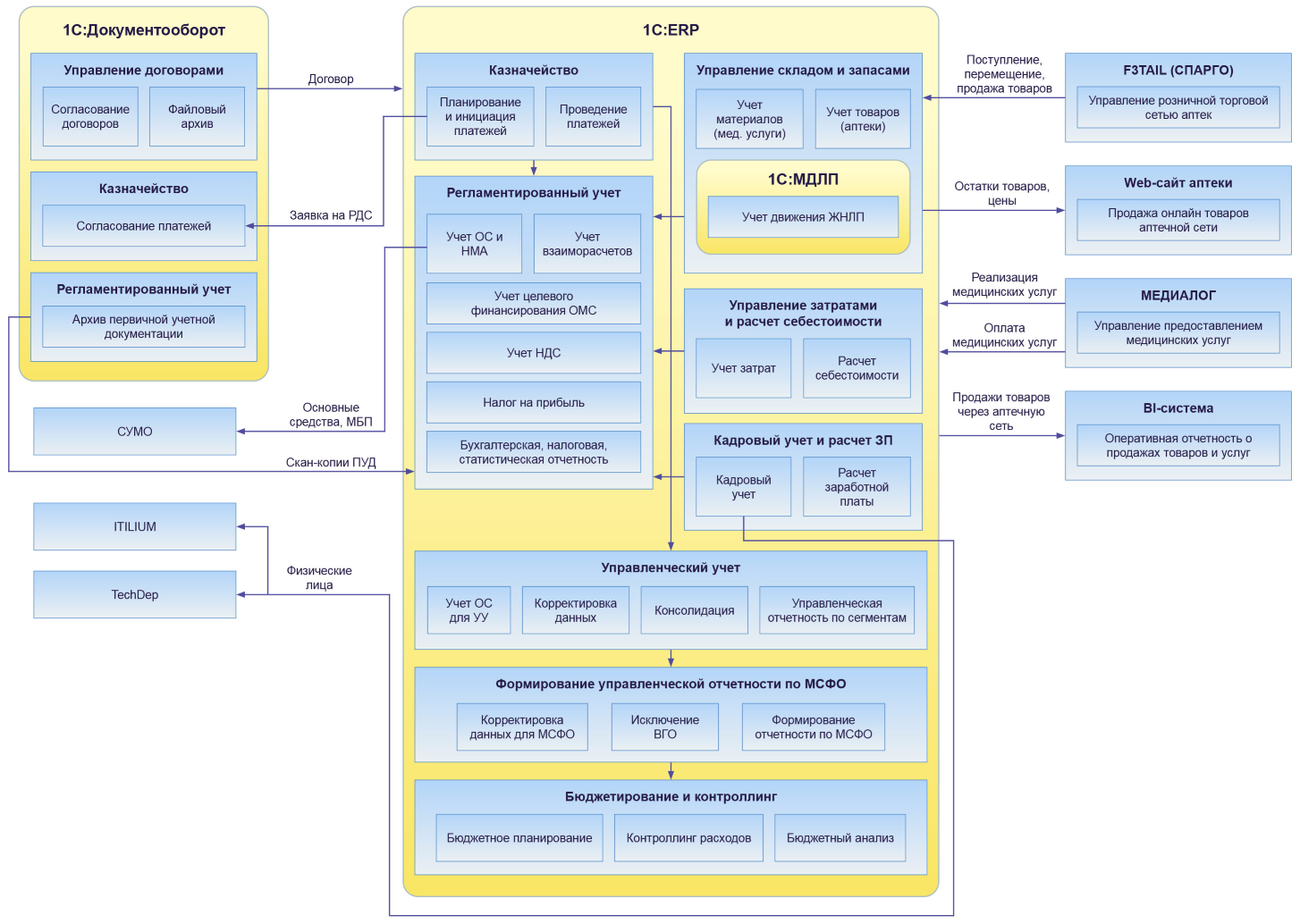 · Закупки товарно-материальных ценностей и складской учет с учетом особенностей интеграции с системой 1С:МДЛП;