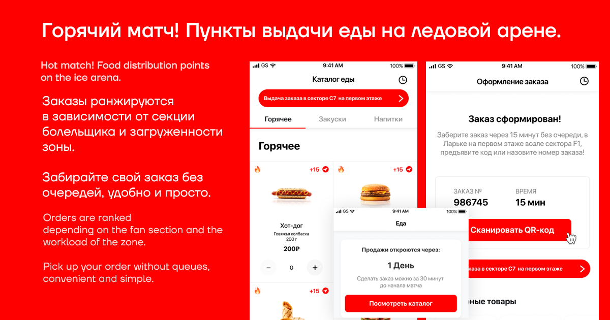 Умная система подачи еды прямо на арене. Заказывайте из своего сектора и получайте еду без долгих очередей.