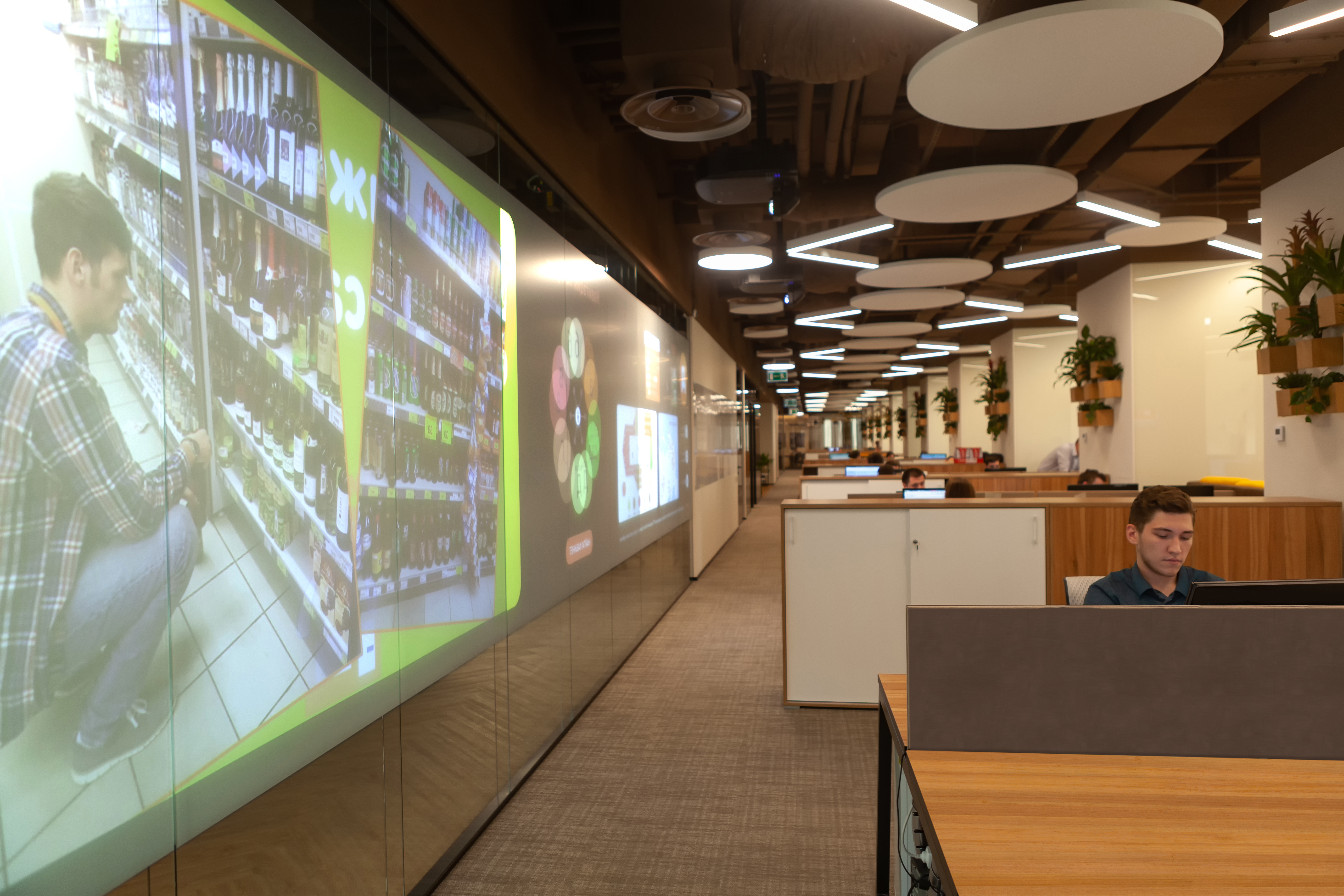 - Видеоролик, посвященный проекту: https://www.youtube.com/watch?v=QVueL-UeMw8&feature=youtu.be Компания «Аскрин» спроектировала и установила в зоне reception главного офиса ГК «Дикси» стеклянную интерактивную стену с тач-интерфейсом. Инсталляция стала основным носителем для корпоративного телевидения и важным имиджевым элементом офисного пространства. Стена разделяет зоны reception и open space, разграничивая, но не «разбивая» пространство, и сохраняет естественное освещение за счет прозрачности конструкции. Три проектора Epson формируют единое изображение на большой площади - почти 18 квадратных метров. Оно не теряет яркости вне зависимости от условий освещения и не перекрывается тенями подходящих к инсталляции людей. Корпоративное телевидение в «Дикси» работает на платформе по управлению цифровым контентом Addreality. На сенсорную стеклянную панель выводится информация о корпоративных мероприятиях, погоде, курсах валют, цитаты дня. Помимо этого, экран показывает карты присутствия «Дикси» по всей России, а также выполняет навигационную функцию для 500 сотрудников офиса. Система централизованно управляется с помощью планшета. Установка инсталляции позволила трансформировать офисное пространство, способствовала развитию корпоративной культуры компании и позволила оптимизировать взаимодействие между коллегами. ***