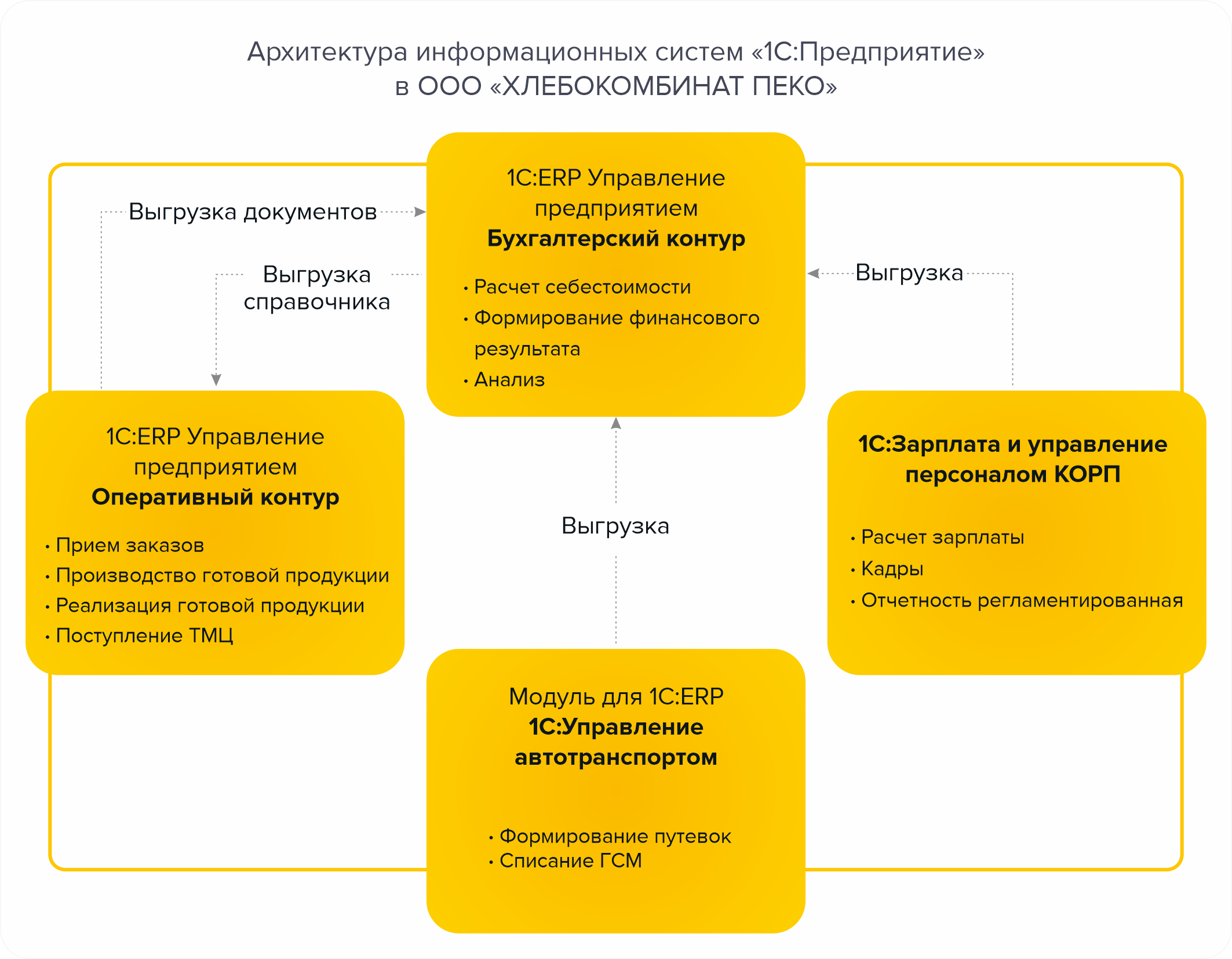 В результате цифровизации подразделения хлебокомбината работают в единой связке. Менеджеры выгружают заказы из внешней базы приема заказов в оперативный контур, далее формируется заказ на производство, содержащий информацию, сколько необходимо произвести изделий. По мере готовности продукция перемещается на экспедицию, на основании заказов выписываются документы реализации, логисты готовят маршруты доставки. Оперативный контур интегрирован с бухгалтерским, и блоками управления автотранспортом и расчета заработной платы.