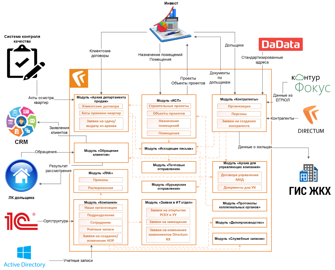 В Directum RX компания хранит информацию о проектах и объектах строительства, помещениях на продажу, разрешениях на строительство и ввод объектов в эксплуатацию.Проекты и объекты строительства затем выгружаются в систему «Инвест», а из нее поступает информация о дольщиках, их клиентских договорах и купленных помещениях. Эти сведения затем используются при продажах, отправке почты и информационных рассылок собственникам помещений.