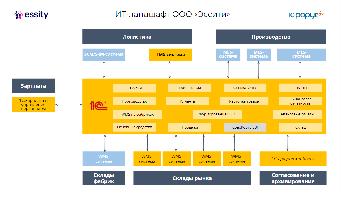 В экосистеме 1С организовано управление всей цепочкой процессов: от формирования потребностей, производства и закупок — до размещения готовой продукции на складах и последующей отгрузки в торговые точки.