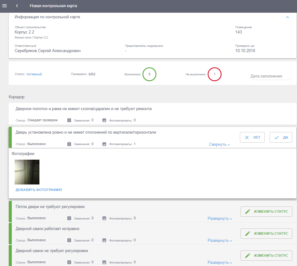 Программный комплекс позволяет создавать карты проверок, необходимые при приемке строительных работ (от производственного контроля на начальных этапах строительства, до сдачи-приемки объекта на завершающей стадии), а также на объектах с повышенными требованиями к безопасности (опасные производственные объекты). Карты проверок через мобильное приложение доступны инженерам строительного контроля, которые находятся на объекте и осуществляют проверку. Руководитель СК в реальном времени получает данные о проверке с объекта, координирует по результатам работу с подрядчиками или исполнителями, формирует отчеты и строит аналитику в разрезе времени.
