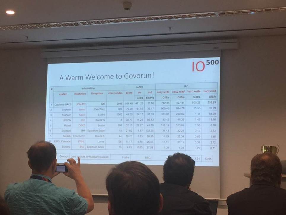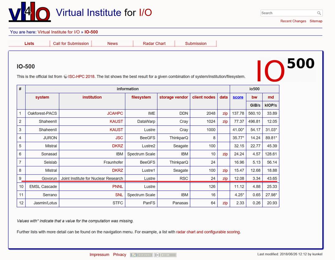 CPU часть суперкомпьютера «ГОВОРУН» ОИЯИ – первое в мире гиперконвергентное решение со 100% жидкостным охлаждением на «горячей воде», оснащенный системой хранения данных на основе твердотельных дисков Intel SSD. Он занял 9-е место в мировом рейтинге IO500 (июнь 2018 г.) для систем хранения данных HPC-класса.Гиперконвергентный серверный узел «РСК Торнадо» хорошо сбалансирован для решения самых различных вычислительных задач и может быть составной частью системы хранения данных, формируемой «по требованию» на базе различных файловых систем (включая создание разделов на базе Lustre) и обеспечивающей интеграцию с различными планировщиками HPC-задач. На базе одного узла может быть создана система хранения объемом до 24 ТБ (до 12 твердотельных дисков) с высокой пропускной способностью и низкой латентностью.
