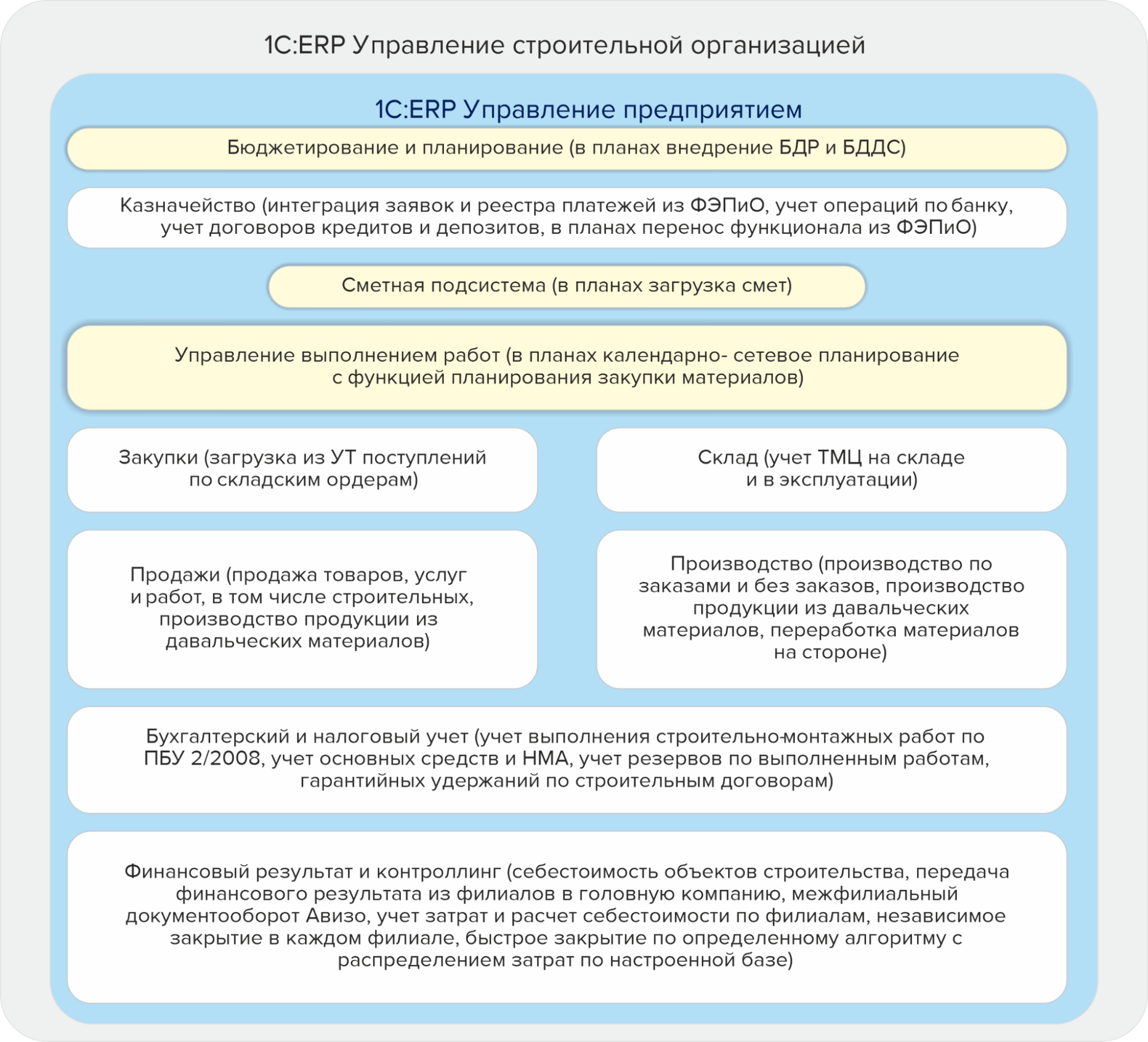 Организация эффективного учета деятельности всех служб, с единым циклом от закупки до исполнения строительных работ.
