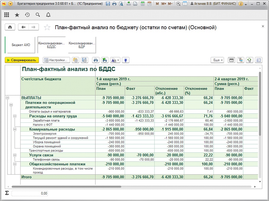 Бюджет движения денежных средств формируется автоматически в разрезе статей оборотов, сценариев, центров финансовой ответственности и других аналитик бюджетирования. Отчет показывает, какая сумма отражена в платежном документе и в факте бюджета и есть ли отклонения между этими суммами (Рис. 6).