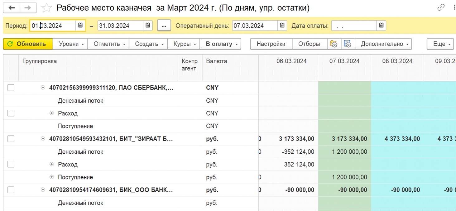 Интерактивный дашборд, который помогает управлять планируемыми потоками денежных средств и следить за фактическим и планируемым остатком ДС. С помощью этого инструмента можно, например, автоматически сформировать платежный документ или «перетащить» сумму платежа на другой день или другой расчетный счет/кассу (Рис. 1).