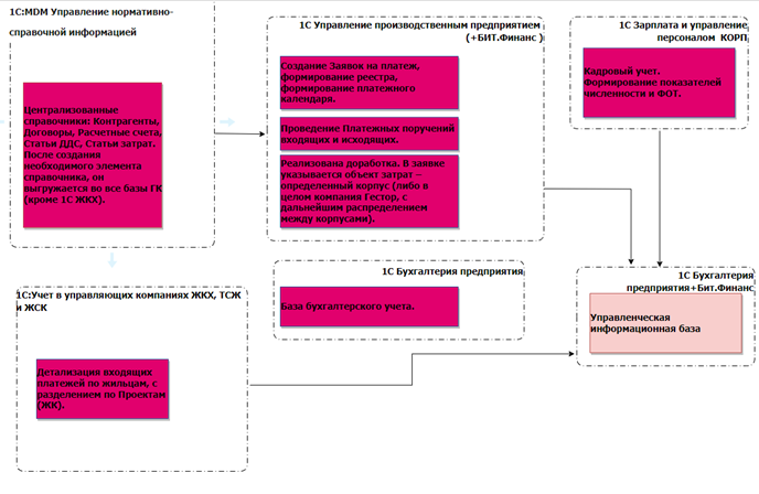 Управленческая отчётность в компании собиралась из решений «1С:Управление производственным предприятием», «1С:Учёт в управляющих компаниях ЖКХ, ТСЖ и ЖСК», «1С:Бухгалтерия» и «1С:Зарплата и управление персоналом». Экономисты выгружали оборотно-сальдовые ведомости в Excel, там же проводили реклассификацию расходов, консолидацию данных. После данные загружались в стороннюю BI-систему. Процесс был непрозрачен, показатели отчётности невозможно было расшифровать до первичной документации или провести дополнительную аналитику.