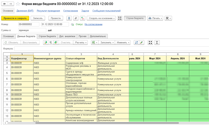Настроили и консолидировали сбор факта по оборотам бюджетов из разных источников: «1С:Управление производственным предприятием», «1С:Учёт в управляющих компаниях ЖКХ, ТСЖ и ЖСК», «1С:Бухгалтерия» и «1С:Зарплата и управление персоналом». Все необходимые аналитики заполняются автоматически: проект, номенклатурная группа, вид деятельности.