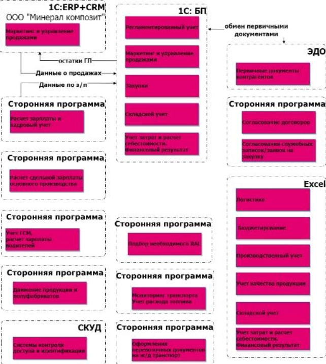 Основные контуры учёта (регламентированный учёт, продажи, закупки, склад, затраты и себестоимость) велись в «1С:Бухгалтерия». Данные кадрового учета и расчёта зарплаты тянулись в стороннюю программу. Как и во многих компаниях, Excel был частью полноценной ИТ-системы, все данные собирались и фиксировалось вручную (логистика, бюджетирование, производственный учёт, учёт качества, склад, финансовый результат). Так происходило потому, что использовались разрозненные информационные базы, внесистемно работали множество дополнительных внутренних программ: