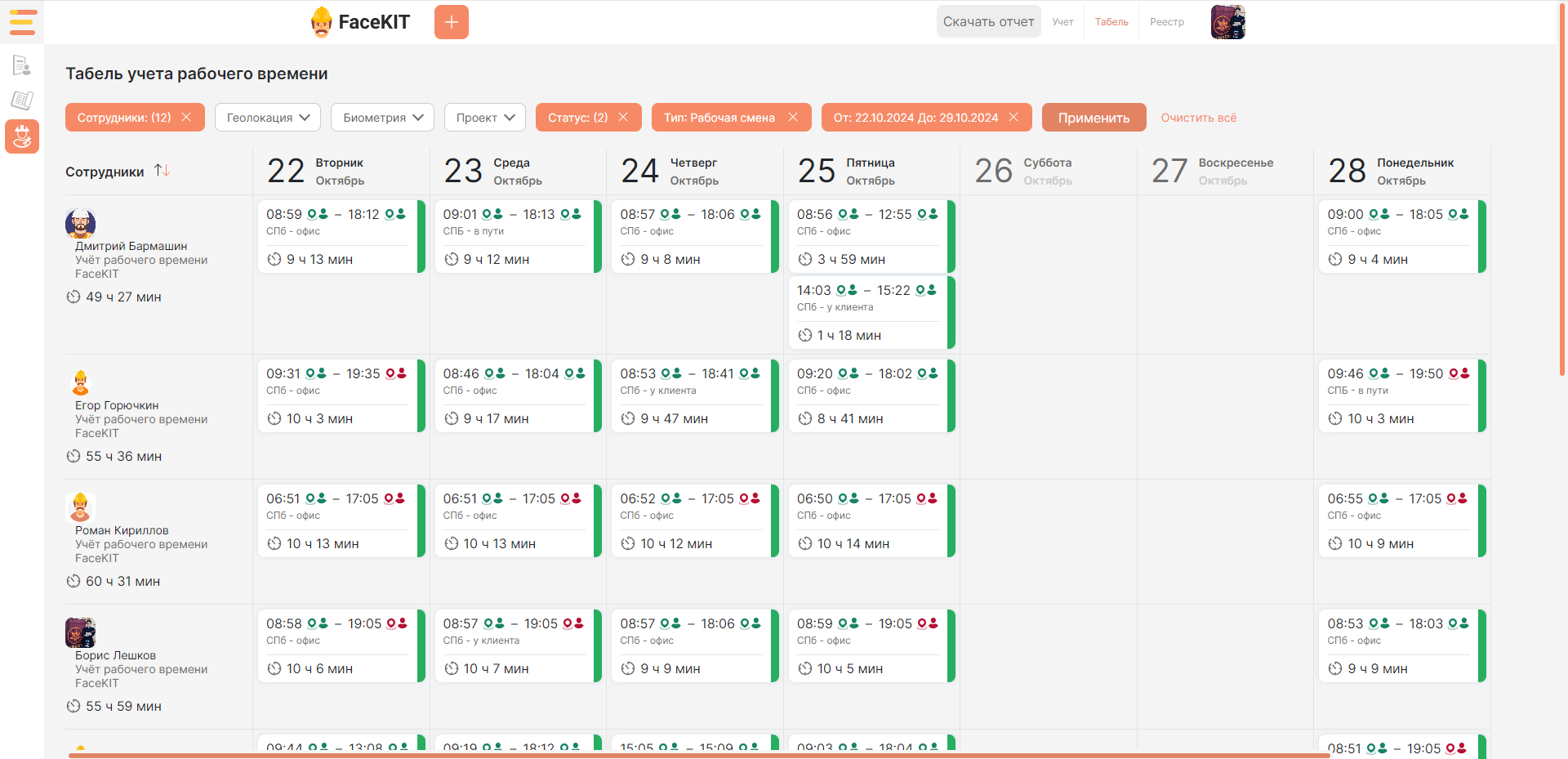 Проект уникален своей адаптивностью для учета рабочего времени персонала строительной организации: позволяет фиксировать рабочее время, отслеживать посещаемость и контролировать соблюдение правил работы как собственных бригад, так сторонних подрядчиков.