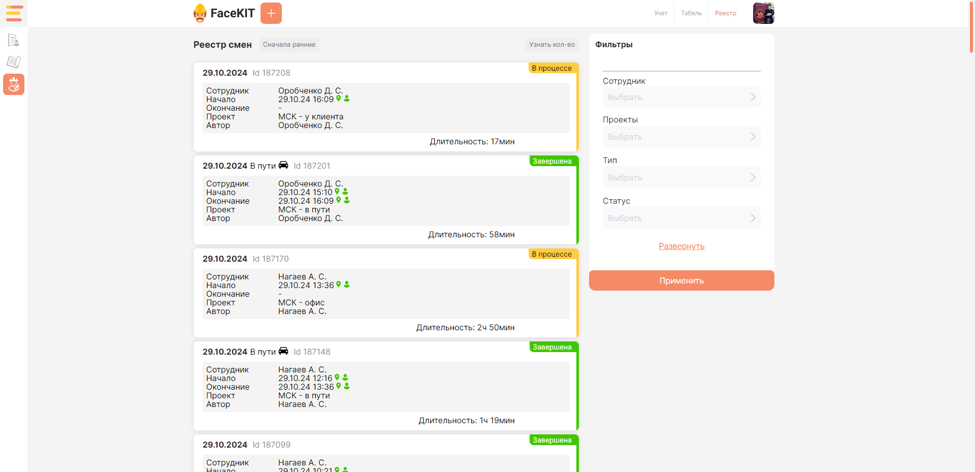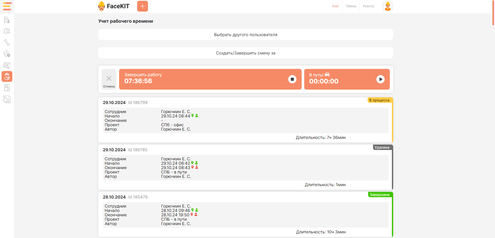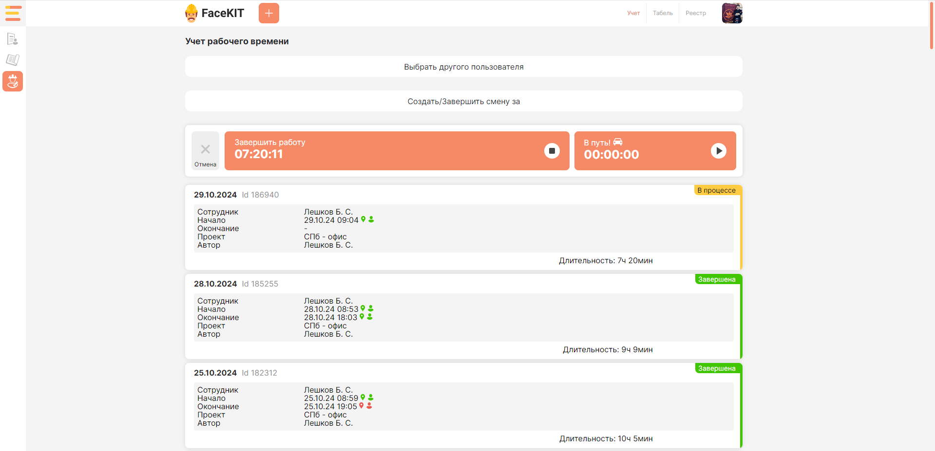 верификация пользователя по лицу при начале и завершении смены;