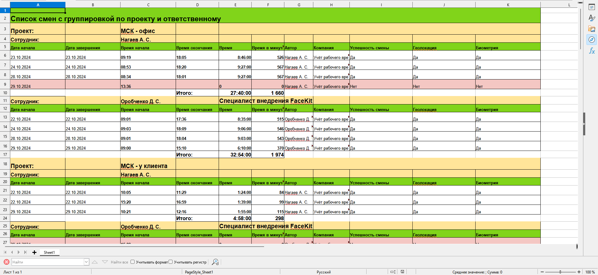 автоматическое создание табеля рабочего времени.
