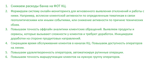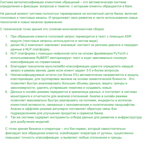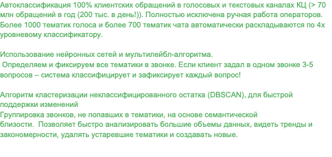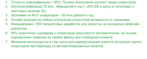 1. Автоклассификация 100% клиентских обращений в голосовых и текстовых каналах КЦ (> 70 млн обращений в год (200 тыс. в день!)). Полностью исключена ручная работа операторов.