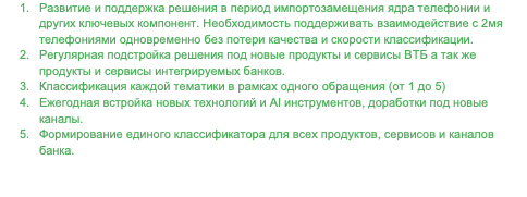 1. Развитие и поддержка решения в период импортозамещения ядра телефонии и других ключевых компонент. Необходимость поддерживать взаимодействие с 2мя телефониями одновременно без потери качества и скорости классификации.