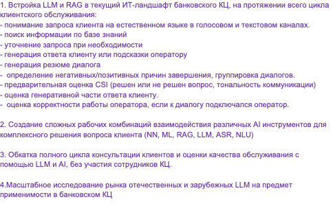 1. Встройка LLM и RAG в текущий ИТ-ландшафт банковского КЦ, на протяжении всего цикла клиентского обслуживания: