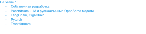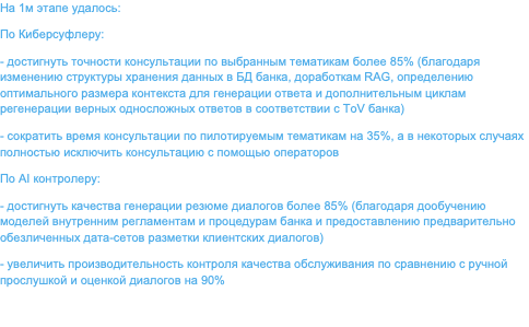 Цели 1 этапа: оценка применимости LLM моделей в банковском КЦ в серии промышленных пилотов, выбор оптимального промышленного решения, подготовка бизнес-процессов и инфраструктуры к этапу 2.