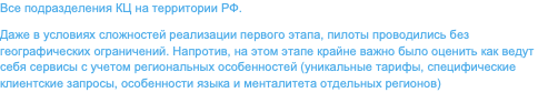 Даже в условиях сложностей реализации первого этапа, пилоты проводились без географических ограничений. Напротив, на этом этапе крайне важно было оценить как ведут себя сервисы с учетом региональных особенностей (уникальные тарифы, специфические клиентские запросы, особенности языка и менталитета отдельных регионов)