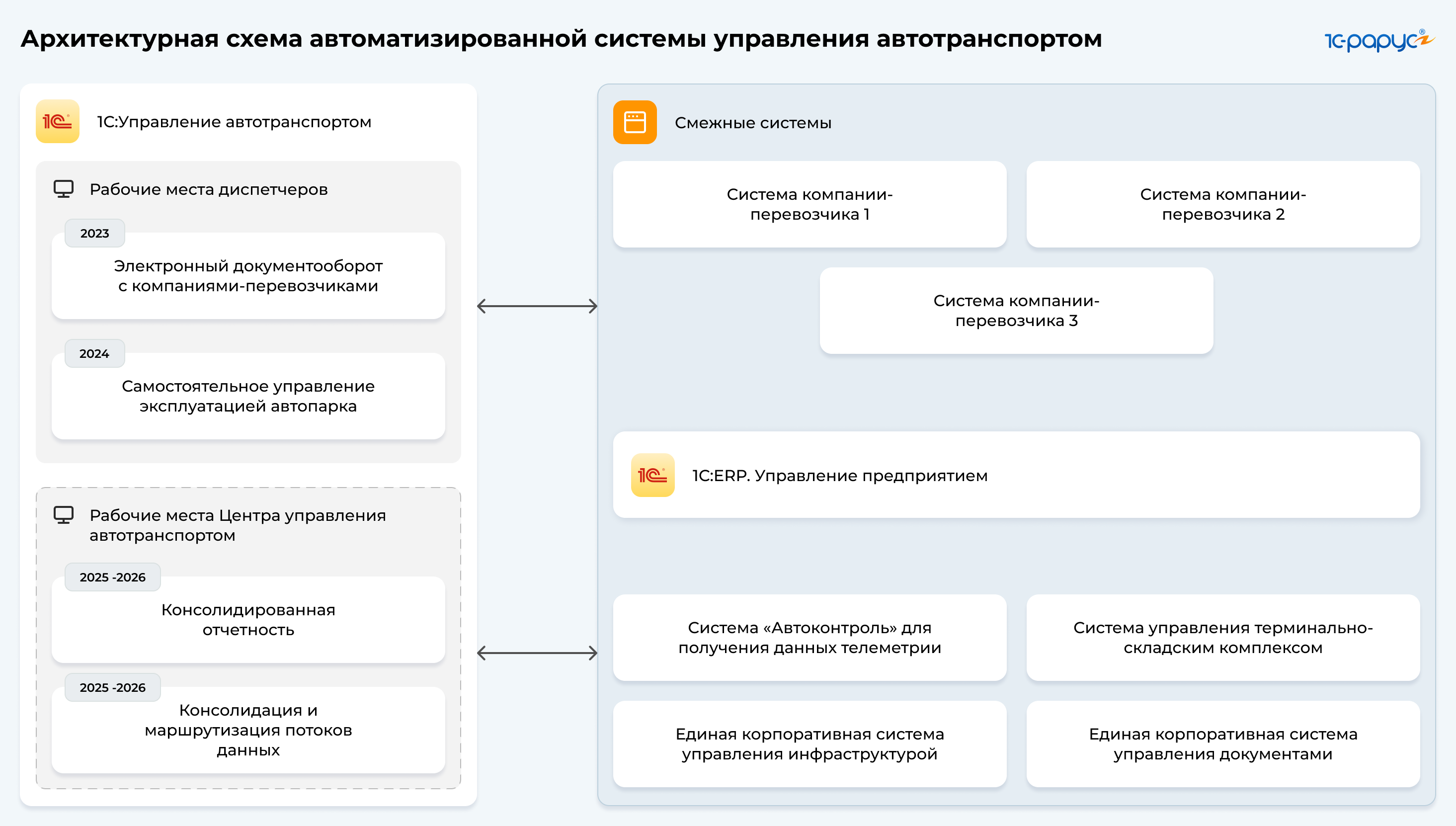 2025-2026 годы: запланировано усиление технической инфраструктуры и тиражирование системы на 16 железных дорог во всех субъектах страны. Планируется настроить: интеграции с «1C:ERP. Управление предприятием» и смежными системами подразделений, которые также осуществляют перевозки в целях производственной деятельности; консолидацию данных и формирование сводных отчетов на всех уровнях управления автотранспортом.