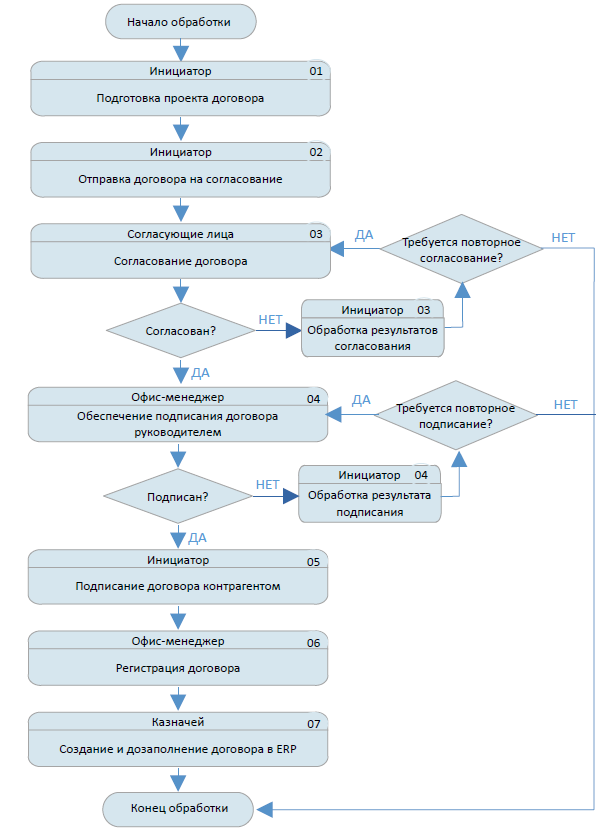 Регистрация договора: настроена нумерация договорных документов и проверка на наличие регистрационного номера в ходе обработки договора.