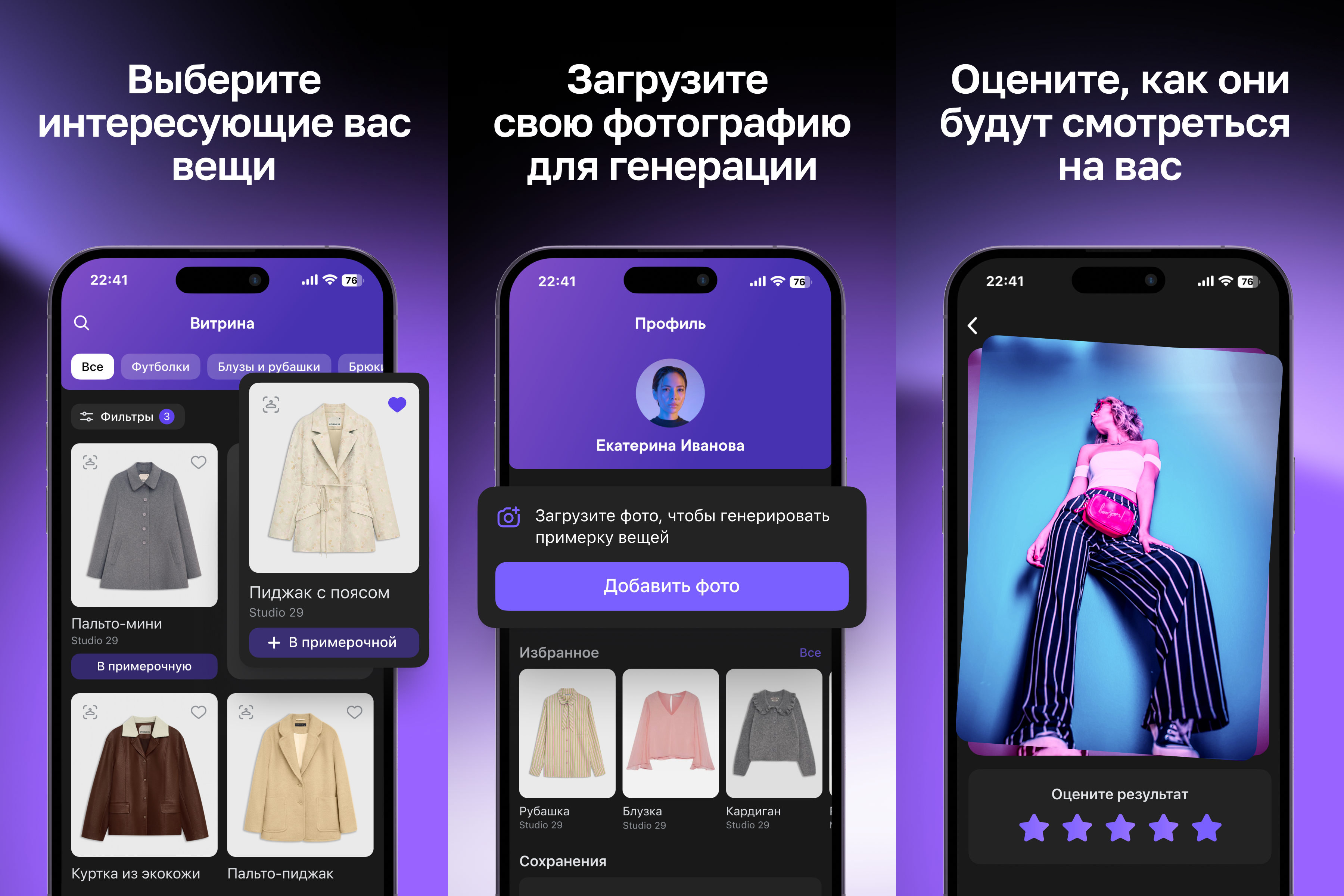 Пользователь загружает собственное фото и может примерить одежду от 20+ российских брендов в формате 2D. ИИ-модель принимает фотографию пользователя и изображение выбранной одежды. Система из девяти специализированных микросервисов последовательно обрабатывает запрос: human parser определяет контуры тела, mask generator создаёт маски для зон одежды, keypoint detector следит за естественностью поз, а диффузионная модель генерирует финальное изображение с выбранной одеждой.