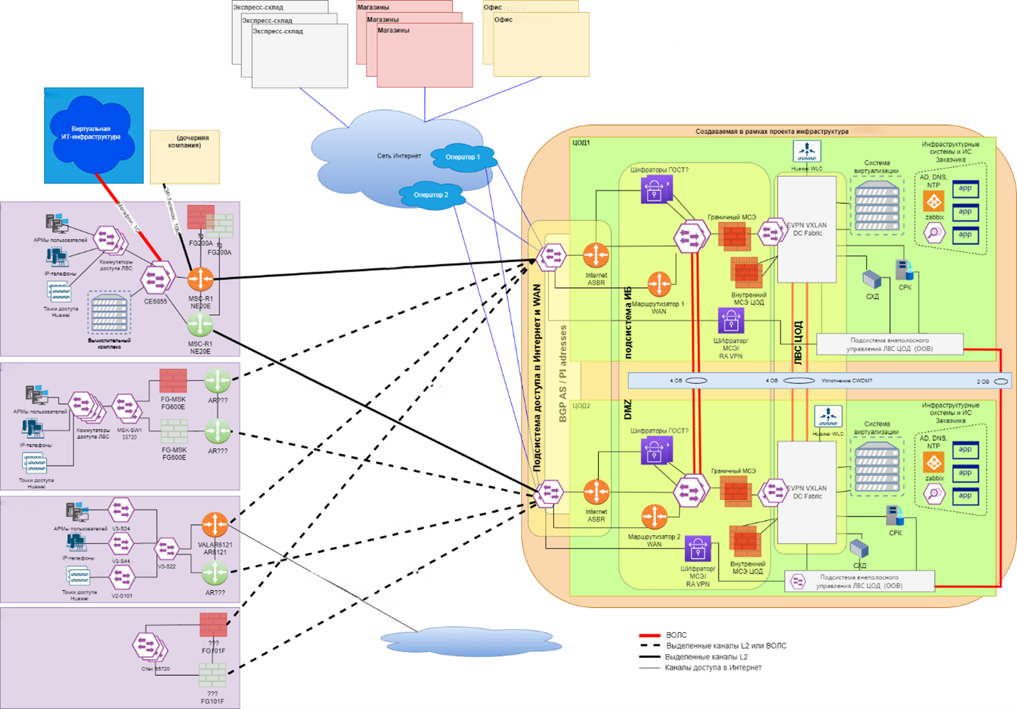 * Между площадками арендованы высокоскоростные оптические линии связи с разными трассами для резервирования и защиты каналов передачи данных;