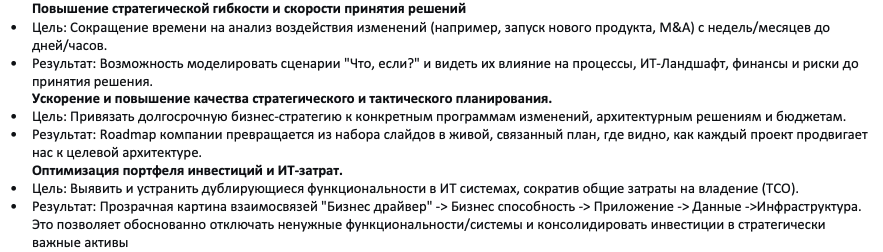 Результат: Roadmap компании превращается из набора слайдов в живой, связанный план, где видно, как каждый проект продвигает нас к целевой архитектуре