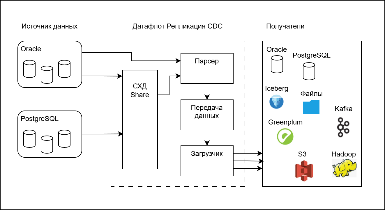 Обеспечить универсальность - поддержку существующих и перспективных источников и приемников данных (Oracle, PostgreSQL, Greenplum, Hadoop, S3, Iceberg, Tarantool, Kafka), возможность репликации данных между разными СУБД
