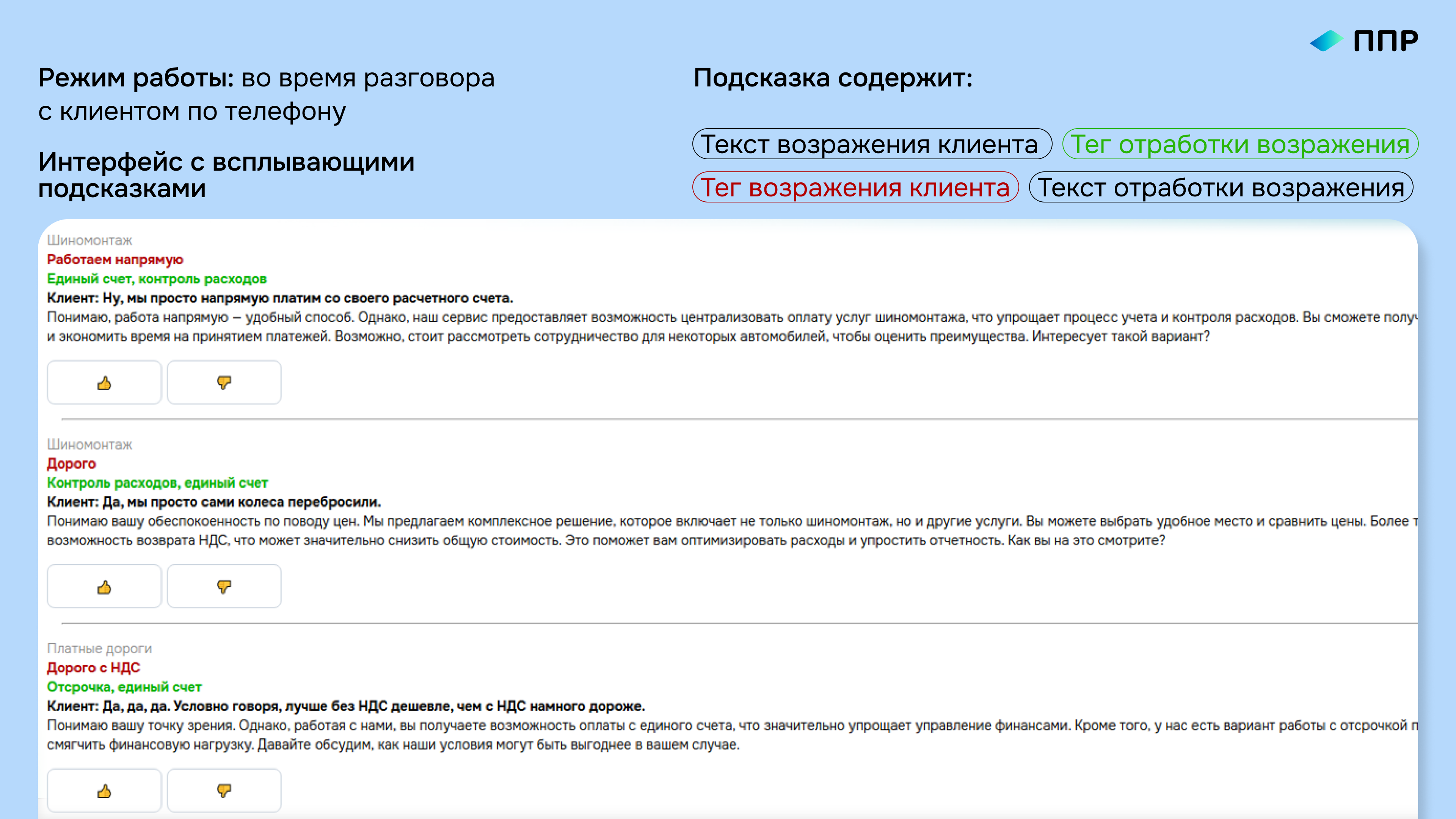 В «ППР» — экосистема 35+ продуктов и 80 тысяч В2В клиентов. При этом в сервисе и продажах есть текучка кадров, а количество наставников ограничено. Долгий выход новичков на KPI/ невыполнение KPI — для компании потенциальная упущенная выгода. Идея проекта: внедрение в процесс ИИ-ассистента, который в реальном времени анализирует диалог с клиентом и предоставляет релевантные текстовые подсказки по отработке возражений.