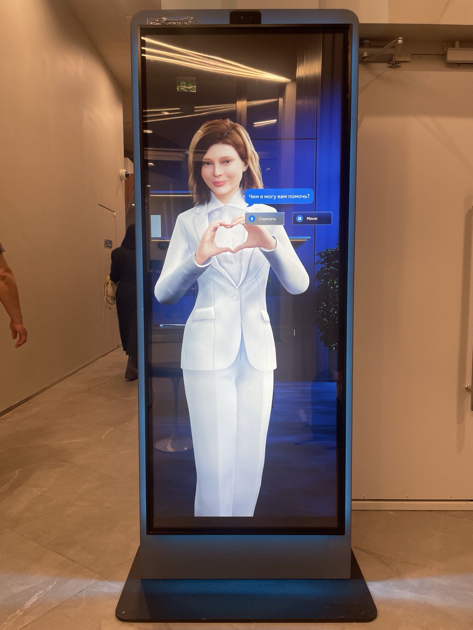 Виртуальный ИИ-ассистент — 3D-аватар в человеческий рост на экране сенсорного киоска осуществляет голосовое обслуживание клиентов в отделении банка, в частности является первой точкой контакта клиента в отделении — приветствует клиента и в зависимости от потребности клиента может: