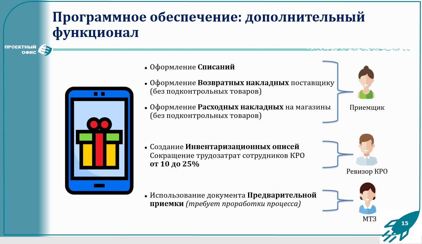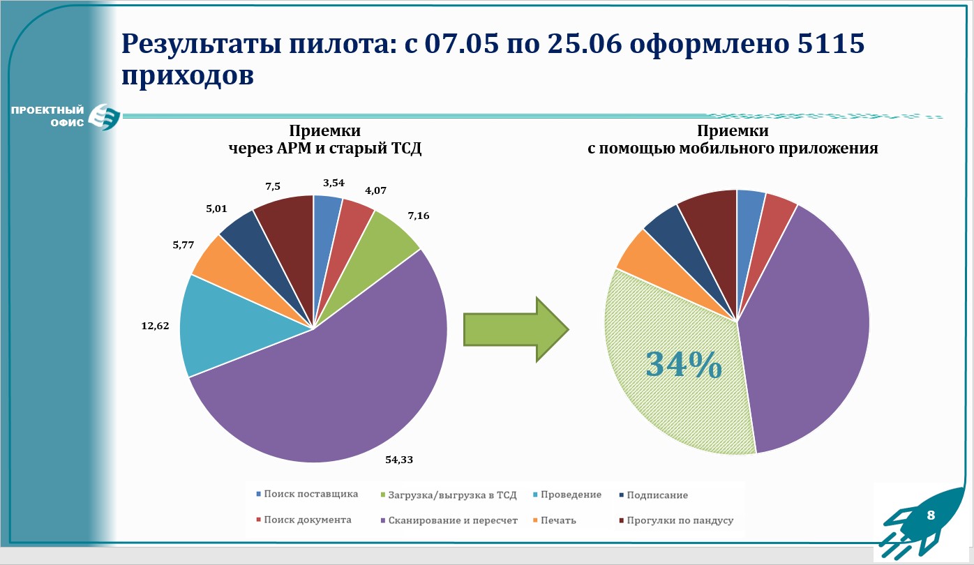 1. Сократить длительность приемки за счет исключения выгрузок/загрузок, лишних «прогулок по пандусу», ожидания проведения операций на стационарном рабочем месте (мобильное рабочее место напрямую подключено к рабочей базе магазина)